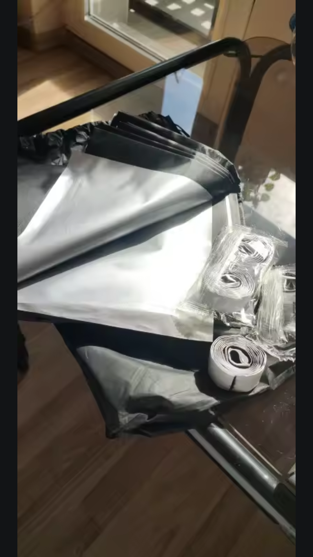 The full installation kit: blackout fabric, velcro strips, magnets, a measuring tape, and a cutter — ready to install.
